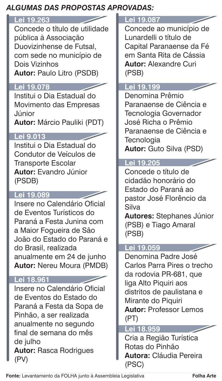 Muitas matérias foram protocoladas para agradar prefeitos que integram a base eleitoral dos autores ou igrejas e outras instituições ligadas a eles. As demais mensagens referendadas se dividem entre as "burocráticas" - validando prestações de contas ou alterando pontualmente normas jurídicas –, as que criam cargos ou estruturas dentro da administração e as que de fato têm influência na rotina dos paranaenses, isto é, que tratam de políticas públicas e programas. Há, claro, várias controversas, caso da que liberou a venda e o consumo de cerveja e chope nos estádios e demais praças desportivas, e das que integravam os chamados "pacotaços" anticrise do governo.