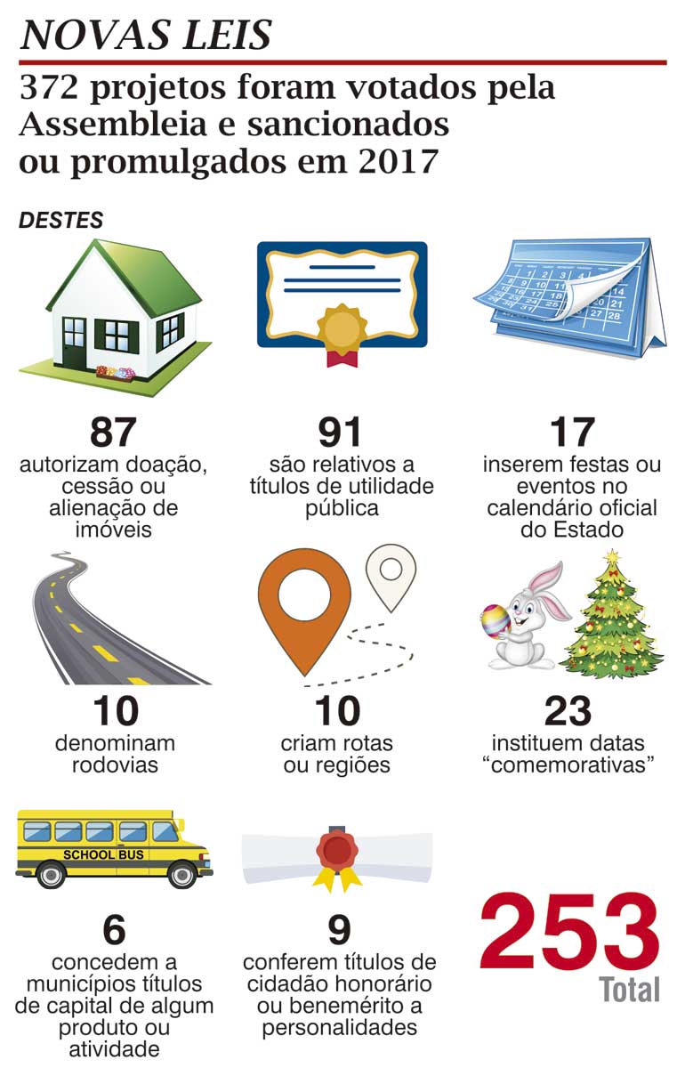 Tal situação vem se repetindo ao longo dos anos. Em 2016, quando 219 textos acabaram ratificados, a proporção ficou em 61,18%. Já em 2015 foi de 54,1%. Entre as novas determinações, 87 autorizam doação, cessão ou alienação de imóveis, nove conferem títulos de cidadão honorário ou benemérito a personalidades, dez nomeiam trechos de rodovias e dez criam rotas ou regiões turísticas [veja infográfico]. Houve ainda 17 mensagens inserindo festas ou eventos no calendário oficial do Estado, 23 criando datas "comemorativas" e seis que deram a municípios o título de capital de algum produto ou atividade.