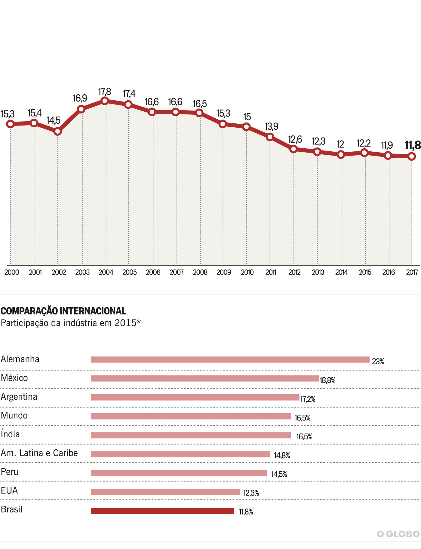 Historicamente, os países que se desenvolvem passam por processos de industrialização, enriquecem e, aos poucos, reduzem a participação do setor na economia. O ponto dos críticos é que o Brasil teria passado por esse processo cedo demais. Segundo dados do Banco Mundial de 2015, os últimos disponíveis para todos os países, o peso da indústria brasileira no PIB, estimado em 11,8% naquele ano, estava abaixo da média mundial, de 16,5%. Por diferenças metodológicas, os números diferem um pouco dos dados do IBGE, que, naquele ano, registrou 12,2%. O indicador brasileiro, no entanto, também estava abaixo do estimado em países vizinhos, como México, Peru e Argentina.